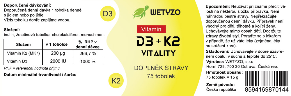 Vitamín K2 - (MK7) 200 μg (266,7% RHP), Vitamín D3 - 2000 IU (1000% RHP)