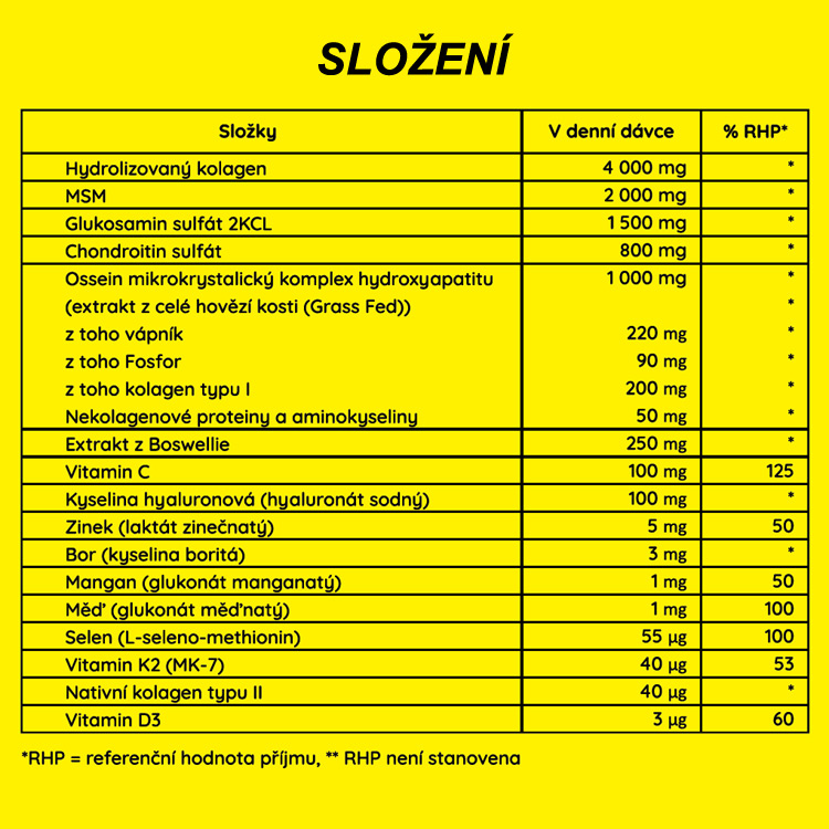 Glukosamin sulfát, Kyselina hyaluronová  a další vitamíny, minerály, extrakty bylin a nutrientů, které přispívají k podpoře zdraví kostí a kloubů a zubů.